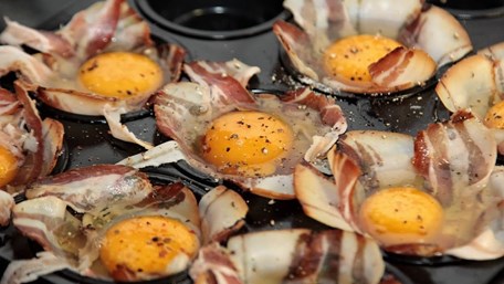 PRIPREMITE (ZA 4 OSOBE): ▶ 8 kriški tanko narezanog kruha ▶ 8 kriški slanine ▶ 8 jaja ▶ 2 grančice svježeg timijana ▶ 4 žlice naribanog polutvrdog masnog sira (gauda, ementaler) ▶ sol ▶ papar